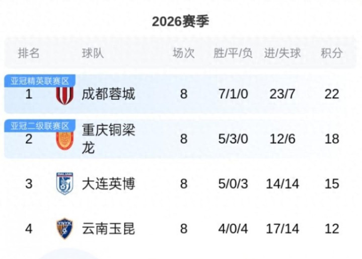 首先还是先关注一下联赛排名靠前的球队,成都蓉城本轮比赛再次大胜对手,由于其他的争冠球队在赛季开始前均遭遇了罚分,让蓉城成为本赛季的夺冠热门。赛季开始后他们也没有让球迷失望,在前面的8场比赛当中7胜1平拿到了22个积分保持不败,领先排名第2的铜梁龙4分。而铜梁龙作为升班马,在新赛季开始后同样表现不俗,如今依然坐稳联赛第2的位置。